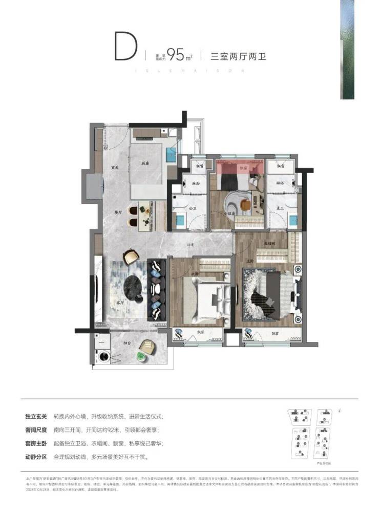 户型设计强调高得房率、LDK一体化、多面采光、主卧套房,满足刚改与改善家庭需求。