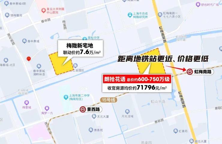 前不久梅陇的另外一块宅地出让,地块距离地铁站步行约1.4km,联动价约7.6万/㎡。
