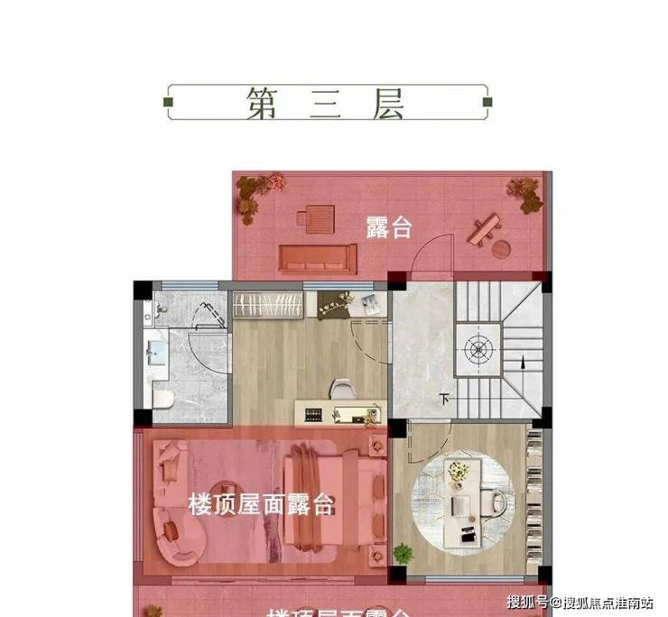 三层,整层套房设计。该层赠送约 23㎡的南北双向大露台,这里作为建筑的“空中延伸空间”,兼具视野开阔、采光充足的优势,无论是打造成亲近自然的露台卧室,还是多功能的生活场域,都能极大提升居住体验。