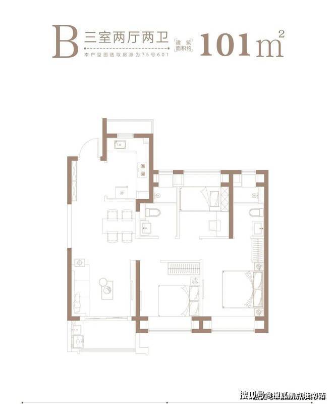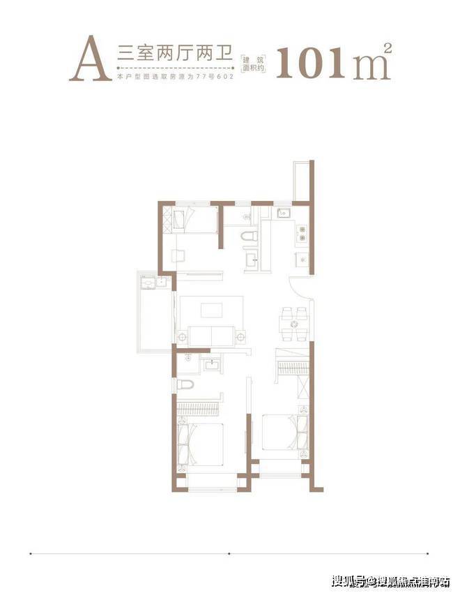 1、约101㎡均为3房2厅2卫,A、B户型分别是边套、中间套,满足不同人群的居住需求。
