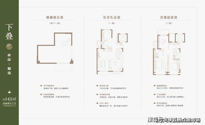 叠墅产品分为4F、6F层叠加, 主力产品建面约约122-133㎡上叠,132㎡大平层,131-145㎡下叠。