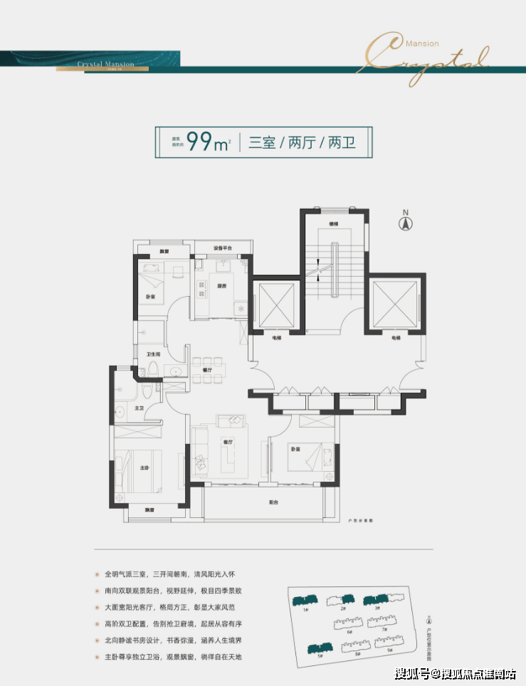 建面约99㎡三室两厅两卫为主力户型,三开间朝南,全明设计,南北通透;约6.3米大面宽阳台,视野、光线双丰收!