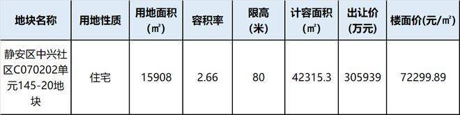 145-20地块项目建设指标如下:总价30.6亿,楼面价72300元/㎡,占地面积15908方,容积率2.66,总建面70701方。其中,地上计容建面42314方,地上不计容建面3387方,地下建筑面积25000方,限高80米。