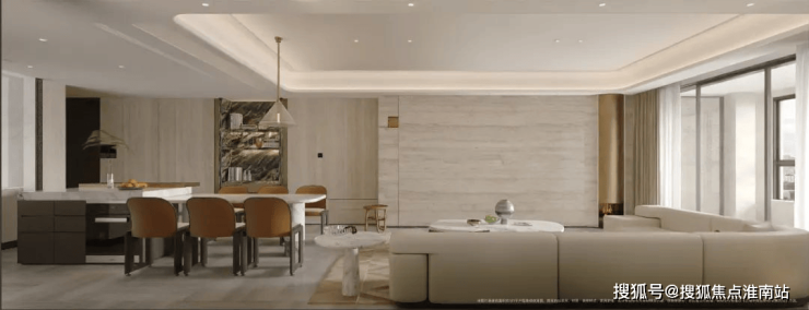餐厅内设有尺寸大约为1.2米乘以1.5米的岛台,采用天然奢石威尼斯棕材质,这同样是交付标准!