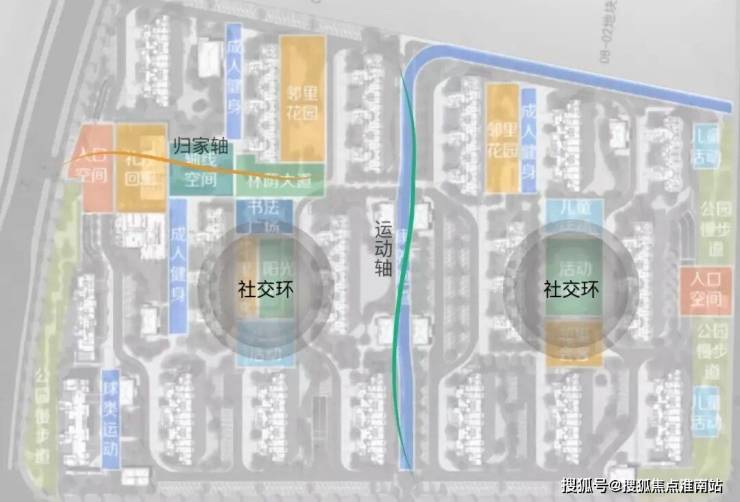 两轴两环三组团自然谧境:归家轴+运动轴,全龄社交双环,邻里花园,健身,运动三组团