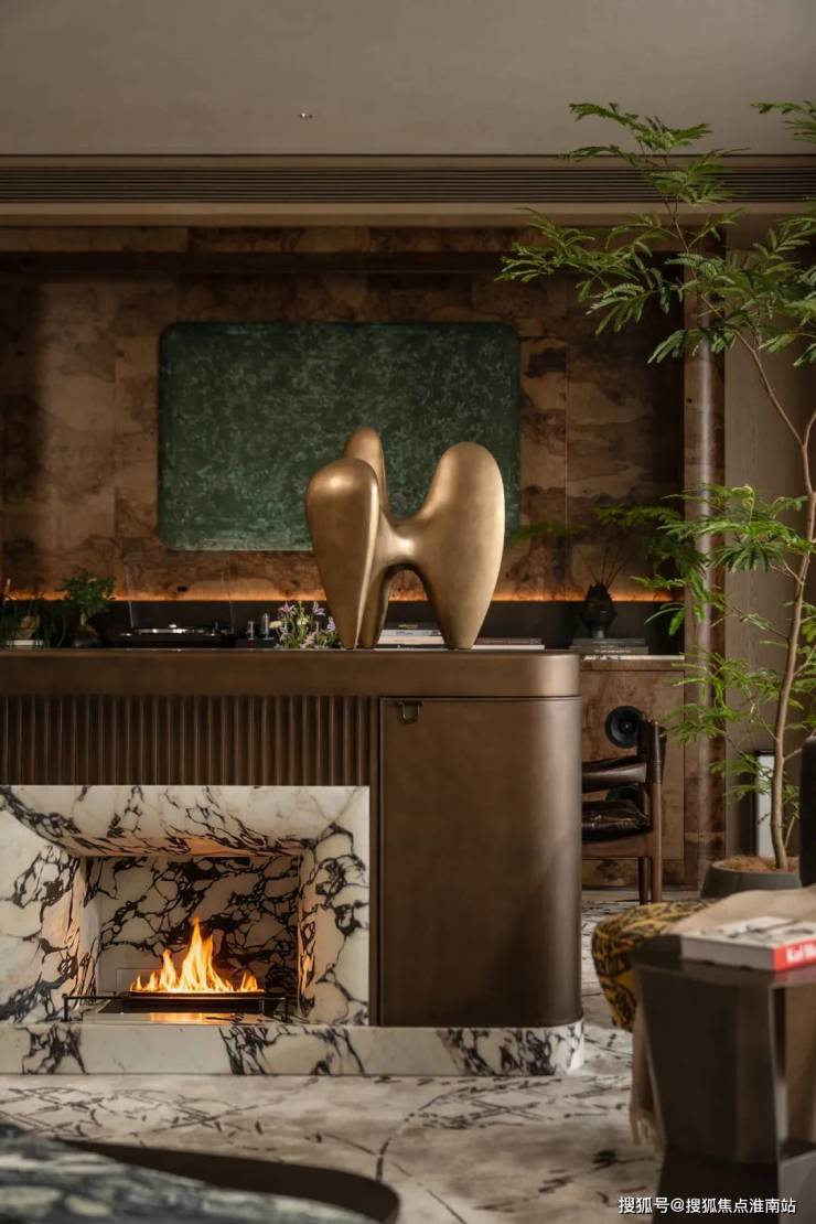 而且这个空间的装标也是非常精致的,1.7米双扇铸铝门,搭配宝格丽石材与祥云灰拼花,延伸至电梯厅。皇家白玉石玄关,兼具储物与展示功能,质感温润。