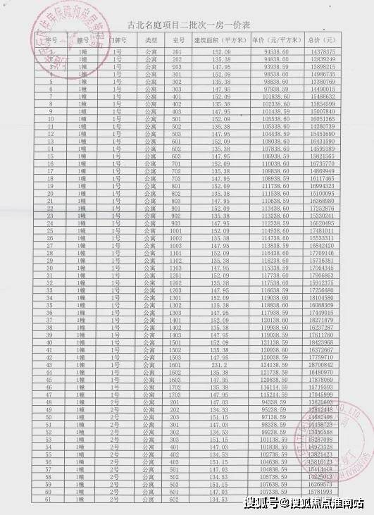 上期一房一价表如下