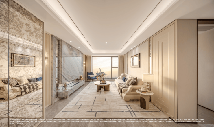 室内墙面大面积铺设温润质感的木饰面,墙面转角处采用曲面处理,为空间注入温馨舒适的居住氛围。