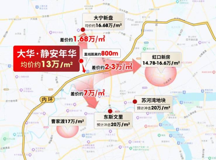 上游东斯文里预计比项目贵7万/㎡,同级虹口新房比项目贵2-3万/㎡,下游新房也比项目高1.68万/㎡,大华·静安年华安全垫拉满!
