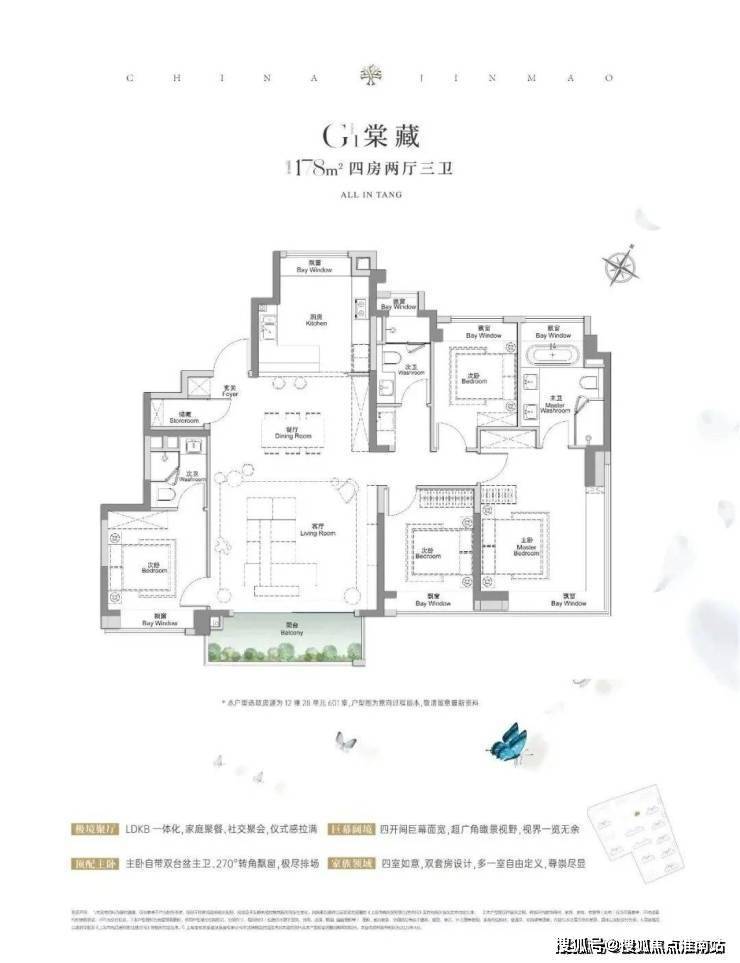 建面约117㎡3房2厅2卫,做到了3+1开间朝南+5个飘窗+主卧套房设计+270°转角飘窗,所有的尺度都有进一步提升。