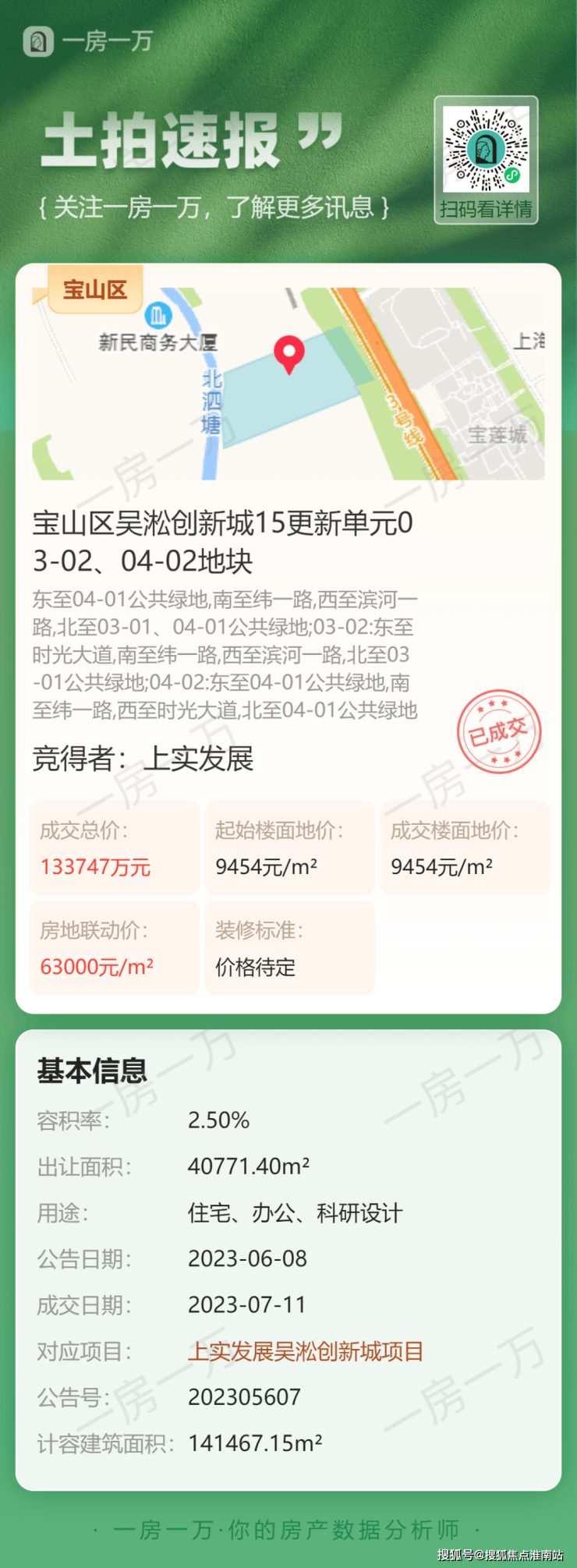 2023年7月11日,上海第二批次2轮土拍中,上实以总价133747万元成交宝山区吴淞创新城15更新单元03-02、04-02地块,地块出让面积40771.4㎡,容积率03-02:2.5;04-02:4.0。溢价率0%,楼板价9454元/㎡,房地联动价63000元/㎡。
