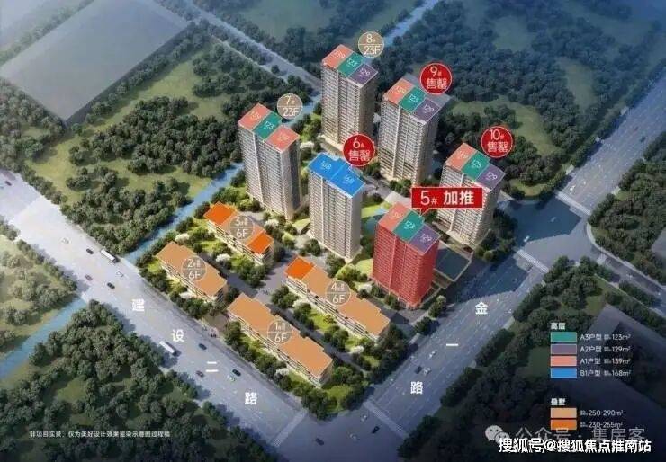 项目位于建设二路与金一路的交会处,依托方正的地形,规划了 6幢高层+4幢叠排,其中高层住宅仅356套。户型方面,本次首开的2幢高层 (9、10号楼),主推建面约 123㎡的中间套 ,以及建面约 129㎡、139㎡的边套 ,均为四房两厅两卫全明格局。