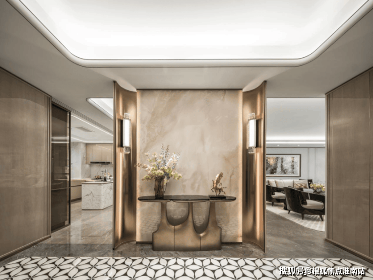 以玉兰门庭—迎归大堂—莳花荟为主轴,敬献步履生辉的归家艺旅:玉兰门庭如繁花盛绽,尊华瑞鳞水景聚运生财,双尊铜狮镇守家宅;迎归大堂流转光影艺韵,百羽栖澜艺术雕塑、芦海宸韵非遗绣作流淌摩登气韵;莳花荟中央会客厅移步异景,献映会客、休闲等雅会。