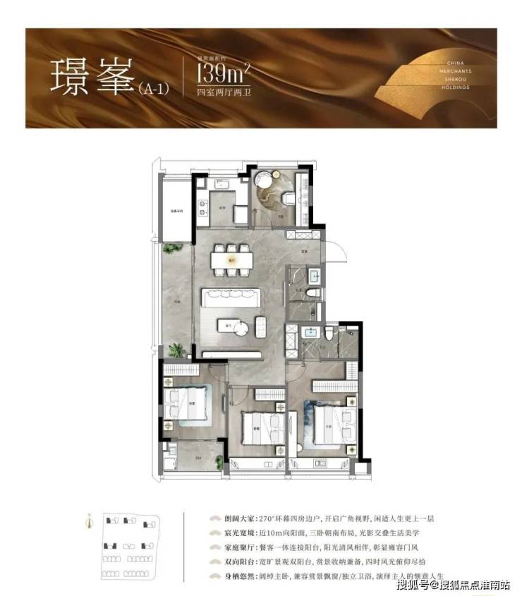 以中间套为例,建面约123㎡的户型做到了主次卧+客厅四开间朝南,伸展开约13.3米的超大面宽,对应双开间阳台与飘窗的设计,进一步提升了全屋的采光。此外,一体化的餐客厅,“一镜到底”活动空间,在视觉上拉大了户型的朗阔尺度。