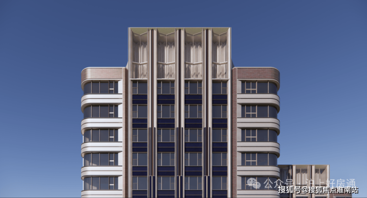 住宅立面颜色以珍珠蓝为核心,搭配香槟金、海派红,两侧还采用弧形设计,比方正的建筑看起来更柔和,也让视野更大化,实现约270°观景。