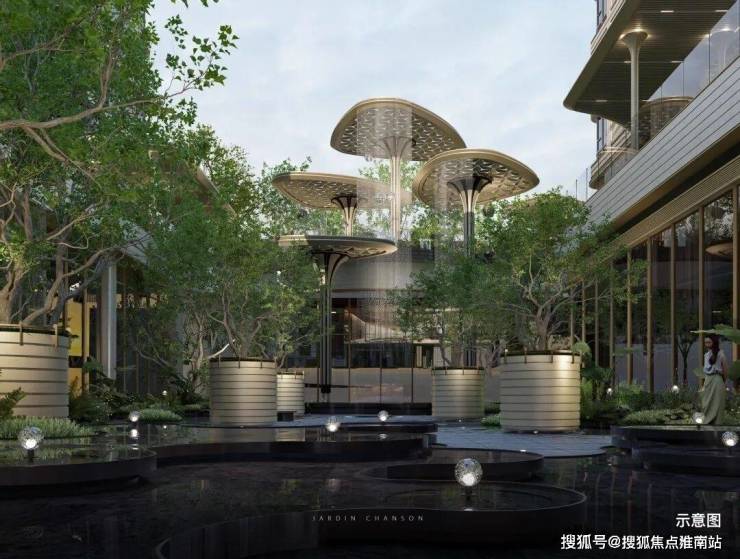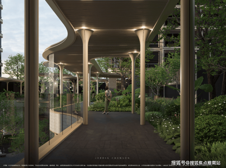 莫奈花园会所的下沉式庭院设计,由“气泡花园”、“森之庭院”、“光影连廊”、“铝板立面” 构成了全新的景观体系,通过巧妙的室内外和垂直上的空间联动进行统一的动线规划造景,营造出丰富的园林空间体验感。