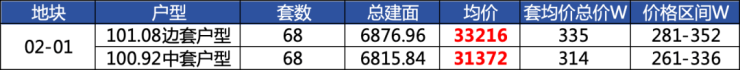 02-01地块位于整盘中心,妥妥C位,且该地块前后均为商业地块,仅此住宅楼宇,该地块也设计了本项目最大户型建面约464平户型。小面积建面约101平A户型68套, 均价约33216元/平,总价约281-352万;约101平A1户型68套, 均价约31372元/平,总价约261-336万。