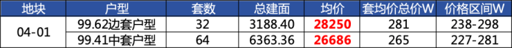 04-01地块可以说是置业门槛最低的地块,囊括 4种户型:建面约99平米A户型32套,均价仅 约28250元/平,总价在227-298万之间;约99平A1户型64套,均价 约26686元/平,总价约227-281万;建面约99平户型方正, 双联阳台设计,采光俱佳,配备步入式衣帽间,套房主卧功能划分更分明。