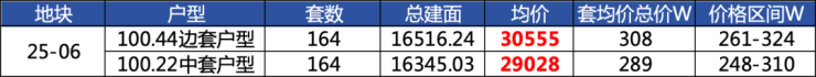 25-06地块背靠二环带城市公园,直面东海,前无遮挡物,妥妥的公园首排位置。该地块最具性价比的户型当属建面约100平户型各约164套, 均价约30555元/平和约29028元/平,总价约261-324万和约248-310万;直面公园的视野,看中景观资源的可以首选该地块,建面约100平3房261万起,又让刚需客群多一种选择,如此性价比实属难得!