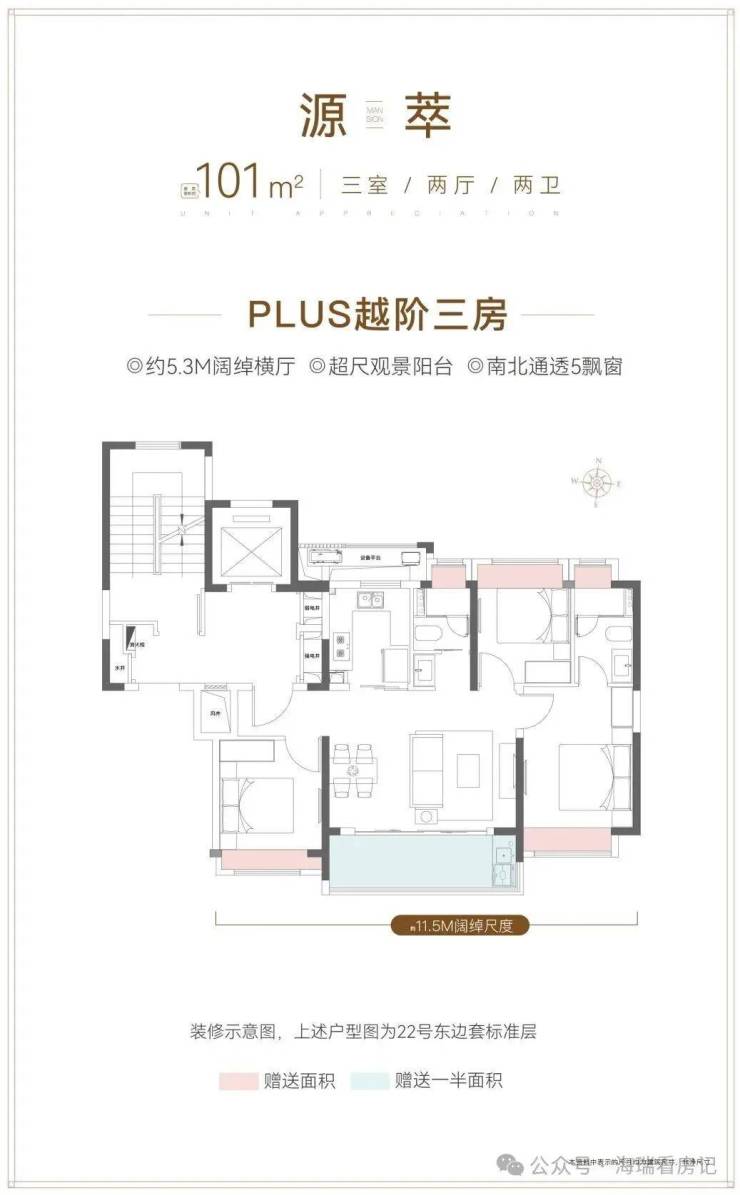 亮点:三开间朝南、约11.5m南向面宽、5.3m阔尺横厅、一梯两户