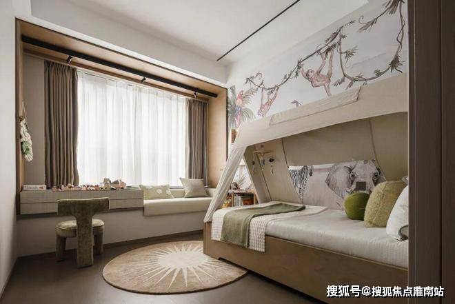 LDKB一体式打造,联动餐厨空间和休闲区,配上超大景观阳台,将室外景色引入户内,打破空间边界,引飞叶与花香穿堂留痕。阳台作为现代人向往自然的精神角落,以秘境庄园为主题进行空间设计,居家步履的尽头,邂逅勃勃生机。周末的午后,阳光打在摇椅上,品一盏清茗,暖意在花间鸟语中绽放。