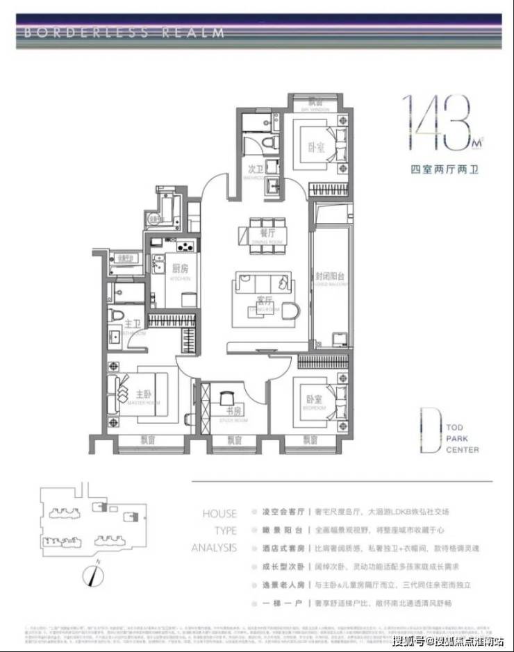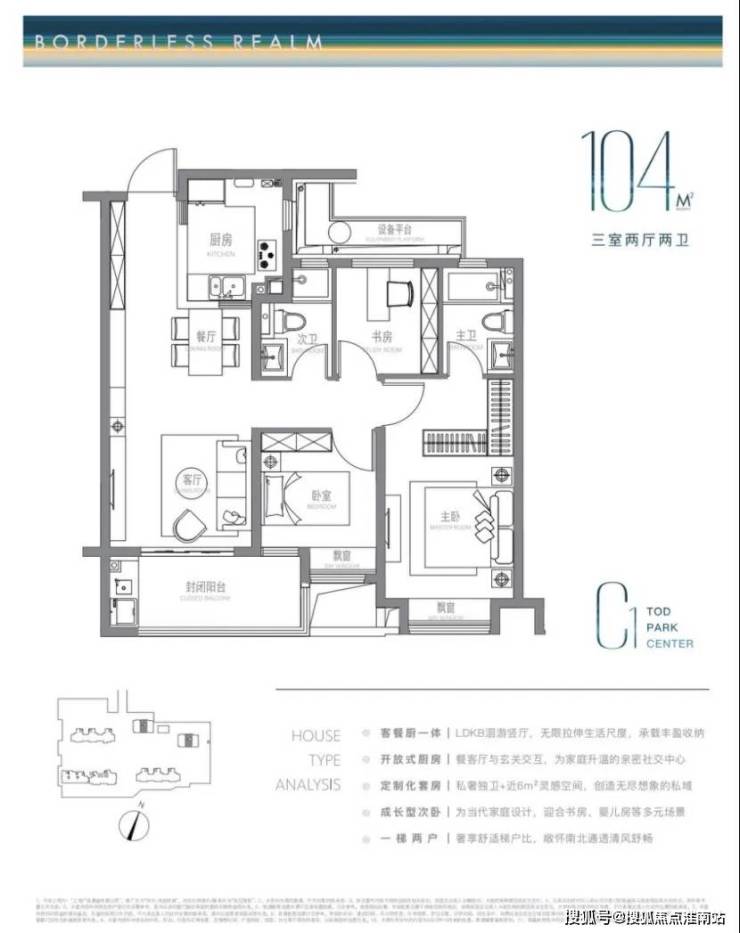 建面约104m²户型特点:LDKB洄游式竖厅+开放式厨房,生活尺度无限拉伸,主卧近6m²灵感空间,承载更多功能可能,成长型的次卧,书房儿童房随心所欲。