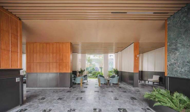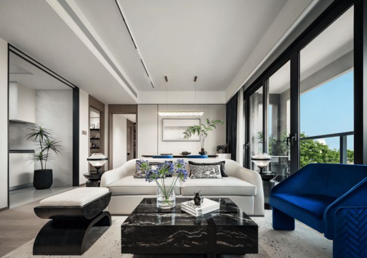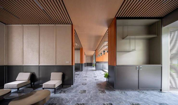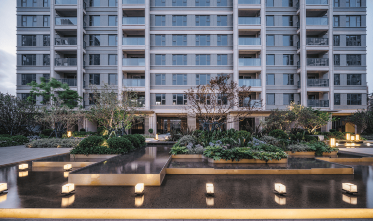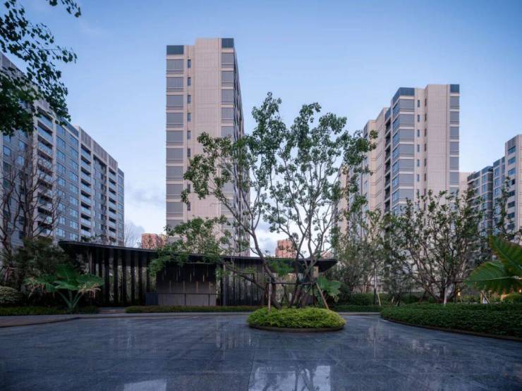 同时,社区内部景观打造了大面积的叠级水景,搭配普拉达绿大理石和浪淘沙石材,呈现整体空间的隐奢基调。