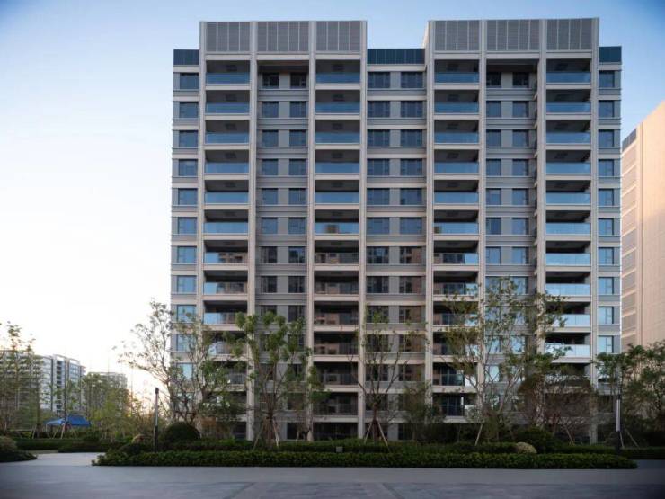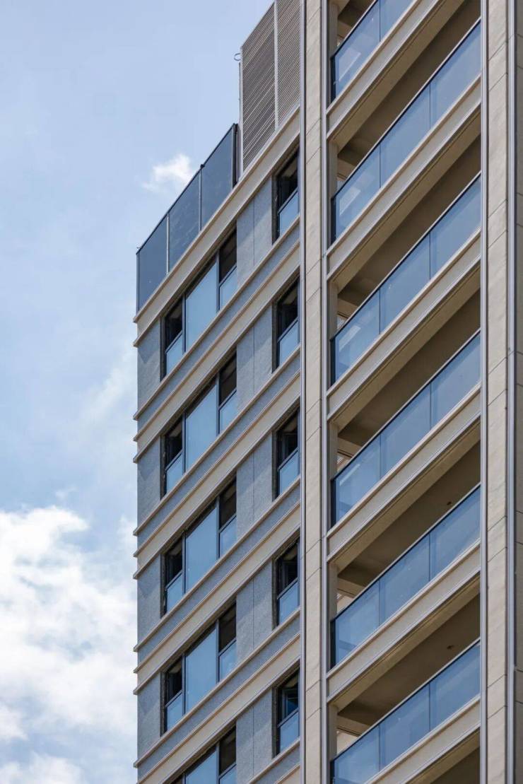 外立面整体形制优雅端正,时尚轻盈,简约有力,横向和竖向金属线条搭配。以简洁现代的线条表达立面感,加上对称的美学,使得建筑整体有着十足的现代感。同时,更大的窗墙比,让每一户的采光都能保持更佳。