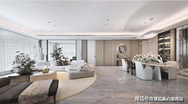 公区方厅第一眼的感觉就是辽阔,建筑面积超90㎡,想举办超大型party都没问题,并且南向开间有约19米,这样的尺度能和市面上四五百方户型的客厅媲美了。