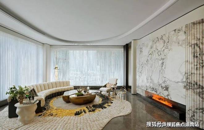 整体设计风格以浅白色为主,客厅背景墙贴着大面积「芬迪白大理石」,弧形的造型配合木饰面,以及酒店级的灯光设计,让整个空间看起来奢华又不失温馨。