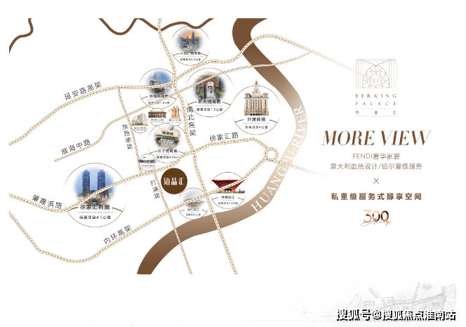 黄浦打浦桥商圈核心,项目地址为上海市黄浦区打浦路。在售202-295㎡云端大平层,总价2400-3580万(单价约12万/㎡)。距地铁9号线打浦桥站约240米,一墙之隔即金玉兰广场,毗邻日月光中心、田子坊。核心卖点:226米地标建筑,FENDI Casa联名奢装,戴德梁行物业,享五星级酒店配套与铂金级管家服务。