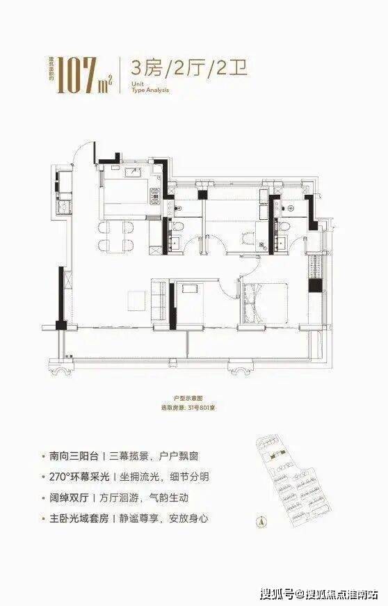 大华星屿建面约107㎡户型南向2个大阳台的合计面积接近16㎡,远超新规标准。如果再算上飘窗附赠以及电梯厅延伸空间,实得率接近100%!同时建面约107㎡户型做到做到了约5米超大宽厅设计,3.5南向面宽+南北通透的格局让采光通风效果俱佳。主卧套房配置,朝南次卧面宽约3.2米外接阳台,朝北带大飘窗,做到了真正的大三房功能,每个空间的尺度都远超同面积段区域其他产品,妥妥的明星户型!