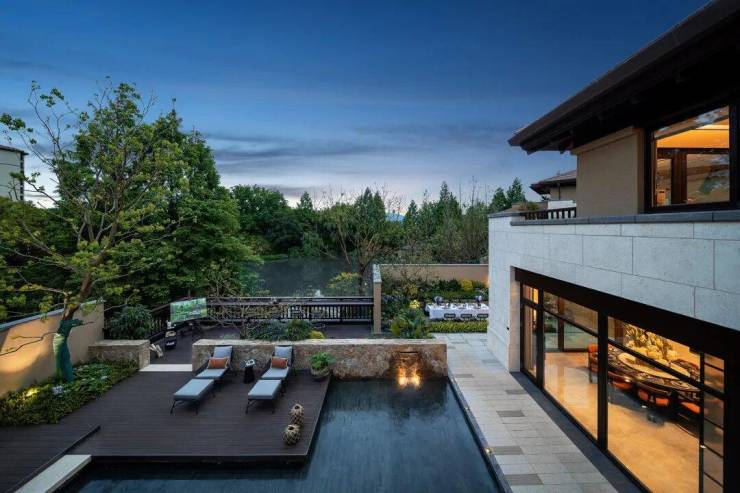一层的平面是「曲尺型」的布局,客餐厅之间以游廊相连,客厅与餐厅以斜45°角的对望关系存在, 中间以内庭水景相隔,巧妙地解决了室内与室外之间的渗透关系。它能带给你心灵上的自由、行动上的自由,这才是真正住别墅的一种意义。