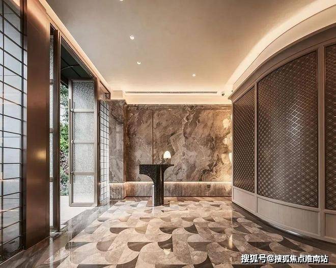 采用米黄色温润石材,巧妙模拟风的流畅形态,营造出既庄重又舒适的归家氛围。这片宽广的流线型石墙在柔和灯光的映衬下,更显璀璨夺目,而风雨连廊的灯带设计,更添一份尊贵仪式感。