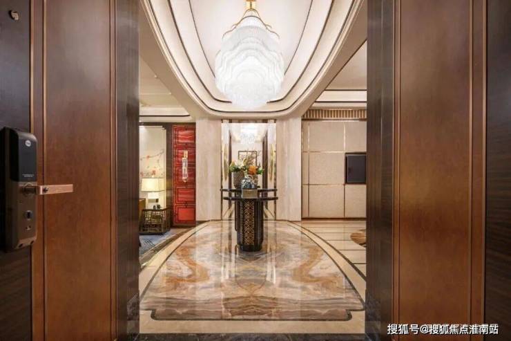 星河湾独有的反复推敲择定的双开大门,以108道工序,手工打造9个月。在吊顶工艺上选用燕尾榫卯拼接,L 角整板裁切。水刀工艺,为每一块大理石无缝匠心拼接。