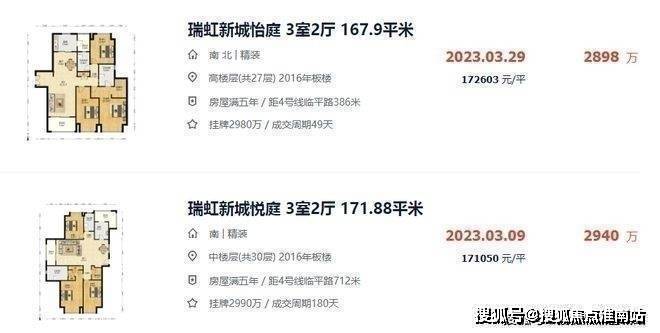 再看二手房,瑞虹新城板块次新房挂牌均价在10-18万/㎡不等,整体上越新的房子越贵,比如瑞虹6789期目前挂牌普遍在15-18万/㎡。