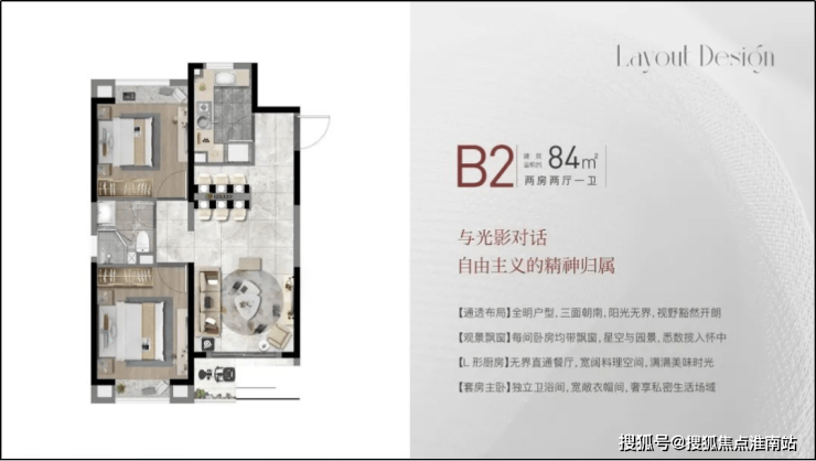 建面约84㎡2房2厅1卫,做到了双开间朝南+双卧室带飘窗+动静分离,非常宽敞的2房户型。客餐厅一体化,客厅南连宽景阳台,整体采光和通透性非常好,非常适合两人世界或三口之家居住。