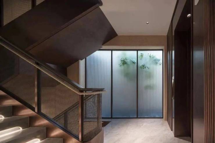 整个泳池天花板,呈现出海派拱形元素,落地玻璃窗外,是下沉式的景观空间: