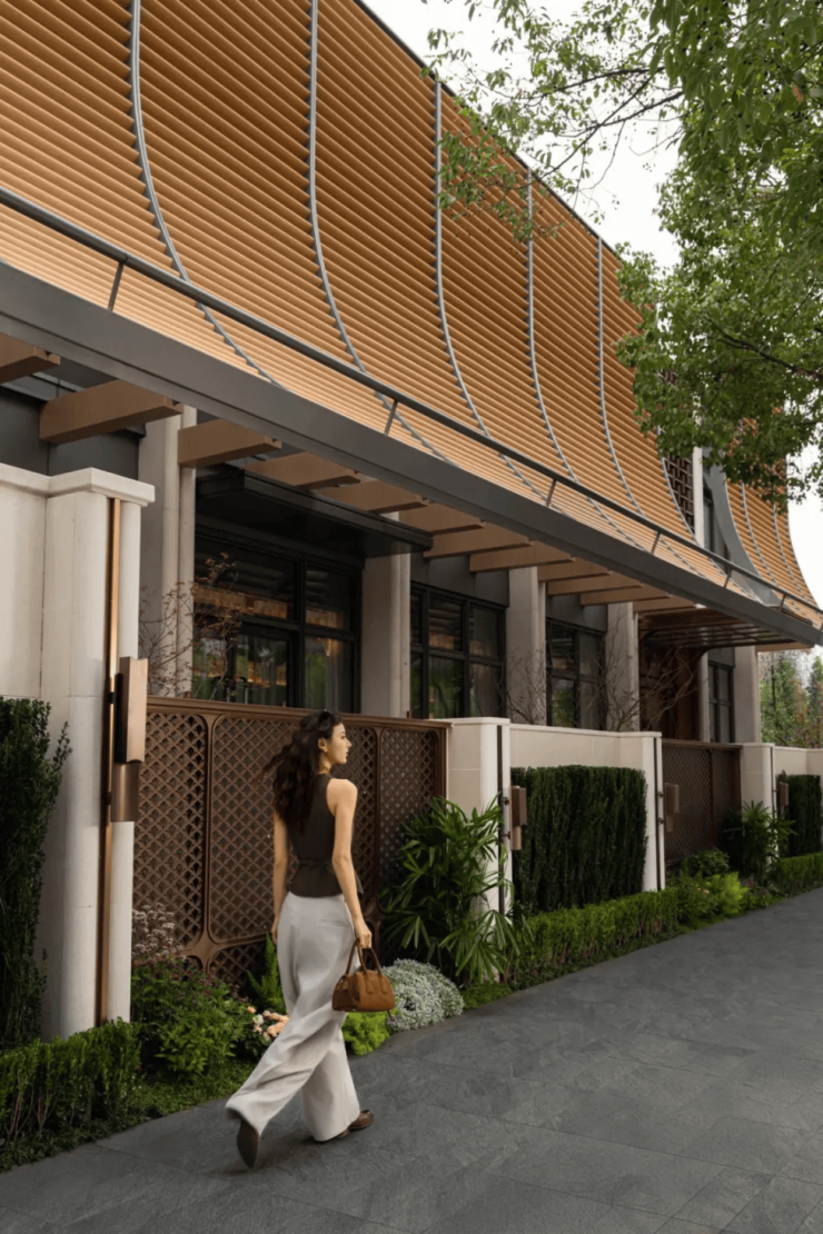 项目约350米城市华墙划定静谧边界,70米疏朗门庭以贝金米黄石材与玉兰花雕塑迎候归人。