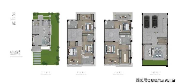 典藏建面约:280-355㎡五至六居(280㎡/326㎡/350㎡法式联排 / 双拼,户户五房起步,多数房间可设计成套房,边套带电梯井,从地下室直通阁楼)