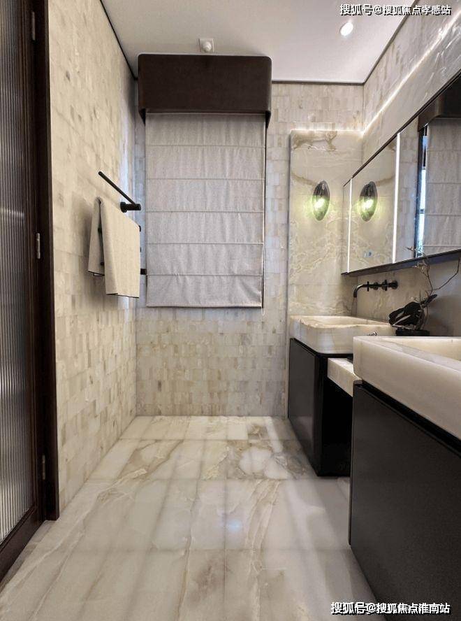 而样板间里这第二个卫浴空间,更接近于享受级。嵌入式浴缸,设计了魔镜系统,可以供业主泡澡时观影娱乐;除此之外,这个卫生间也有独立的淋浴房,并设计有桑拿房。