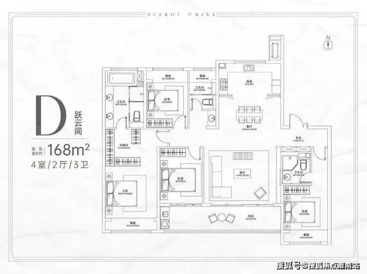 南向四开间,江南云起售楼处电话☎:400-998-9694✔✔约5.1米大横厅,连接约8.1米阳台。主卧套房设计,带步入式衣帽间和明卫,6个飘窗设计。