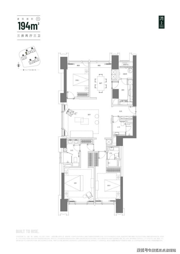 (项目实景图)建面约198㎡3房2厅3卫三开间朝南,标准动静分离户型,进门十字中轴,南北通透,客餐厅有足够长的纵深,极大提高了生活舒适感。主卧和次卧双套房设计,室内5飘窗1阳台,更增加了198户型的空间延展度。未来还可以根据家庭结构的变化,自行改造室内空间布局。