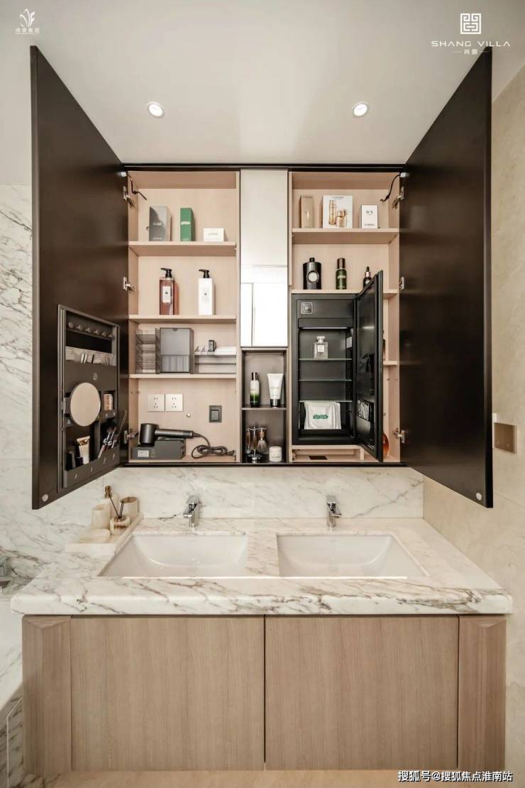 「她享主义」关怀,主卫奢配美妆镜柜、美妆冰箱、可调节镜柜灯、线型浴霸、电热毛巾架,展现海派精致生活。