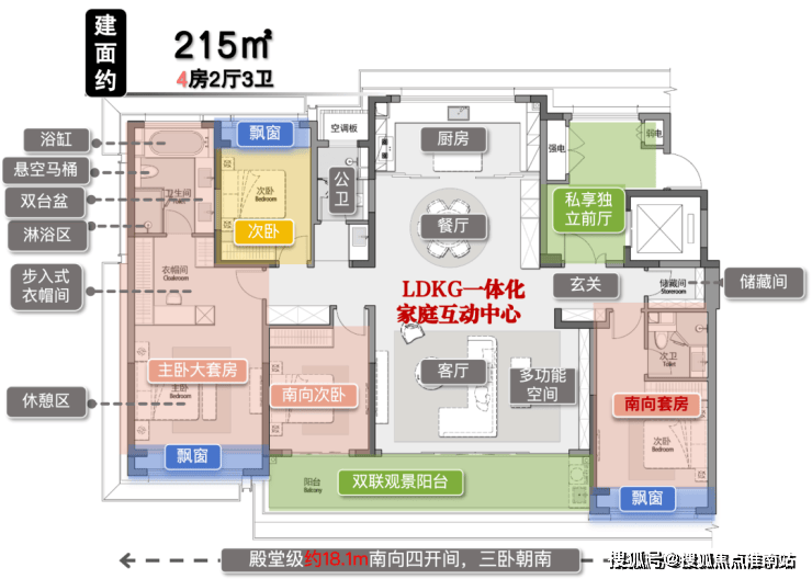 独立入户玄关,4开间朝南,开间18.1米,客厅开间约6.9米,南向双套房,三个南向卧室开间分别为3.3米、3.7米、4.2米,空间非常阔绰.