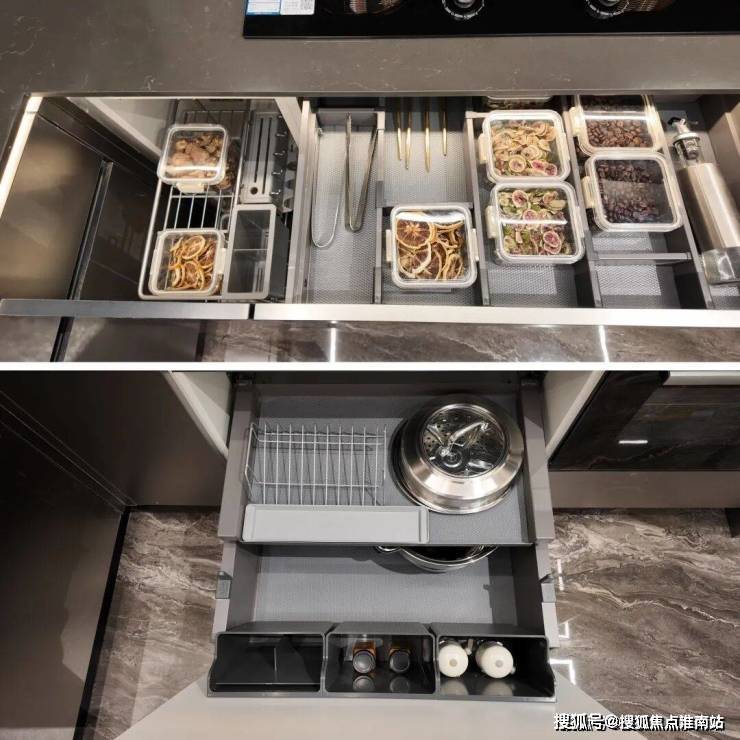 燃气灶下方做好分区的抽屉和轻松抽。台面边缘做了一定角度的斜切,这样即便滴水也不会漏至下方的柜体之中。