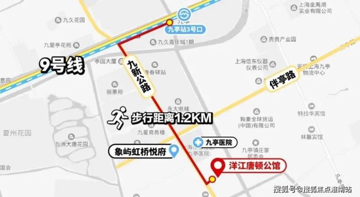 洋江·唐顿公馆直线距离九亭站约800米,实测步行约1.2公里,是当下离地铁站较近的新盘。