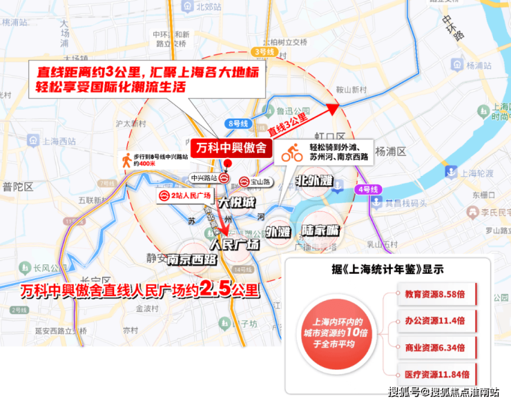 相较于虹口、杨浦,中興傲舍占据天然地理优势,以项目为中心直线距离约3公里范围内,南京西路、人民广场、外滩、外白渡桥、陆家嘴等城市地标星罗棋布。