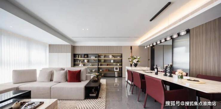 LDKB客餐厨阳台一体化的布局映入眼帘,让公共区域间和谐呼应。约6.6米的尺度横厅和超大面积的落地窗,仿佛为家安装了一块“超大屏”,四季风景尽收眼底。