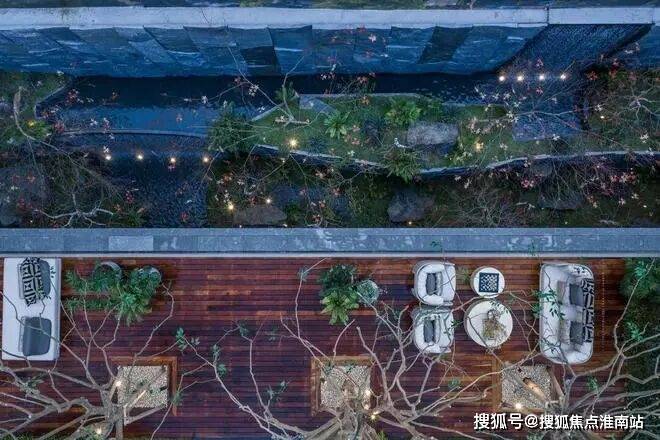 自【悬浮茶室】拾级而上,在【思韵书院】外,一处闲憩放空的【阅川水岸】至此呈现,脚下溪流自脚下蜿蜒而过;眼前,是幻影蓝奢石池底的幽邃微光。一株来自地中海的油橄榄,与一棵百年老桩紫薇在此相望。